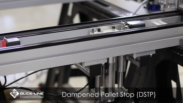 Dampened Stops offer a pneumatic cushioning force to the work piece that slows the impact of the pallet against the stop. The cushioning force can be adjusted to suit specific application needs. Larger stops and higher cushioning forces are available upon request.