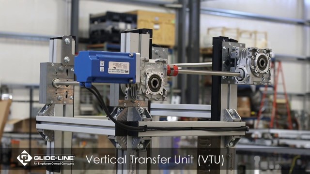 Vertical Transfer Units (VTUs) transfer pallets from one level to another. This unit utilizes a section of transport conveyor as an elevator platform and benefits from a vertical servo-driven actuator for positioning. The elevator platform conveyor can operate in either direction, enabling the VTU to accept and discharge pallets from both sides, and the servo allows multiple stopping positions along the stroke. The unit is supplied as a stand-alone module.